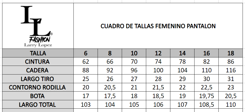 | Talla | 10, 12, 14, 16, 18, 6, 8, 28, 30, 32, 34, 36, 38, 40 |